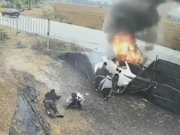 监控画面显示,碰撞发生仅41秒后车辆便开始冒黑烟,约50秒时燃起明火,主驾驶位司机曾自行下车并尝试打开后座车门救人,最终车辆被烧至只剩车架。